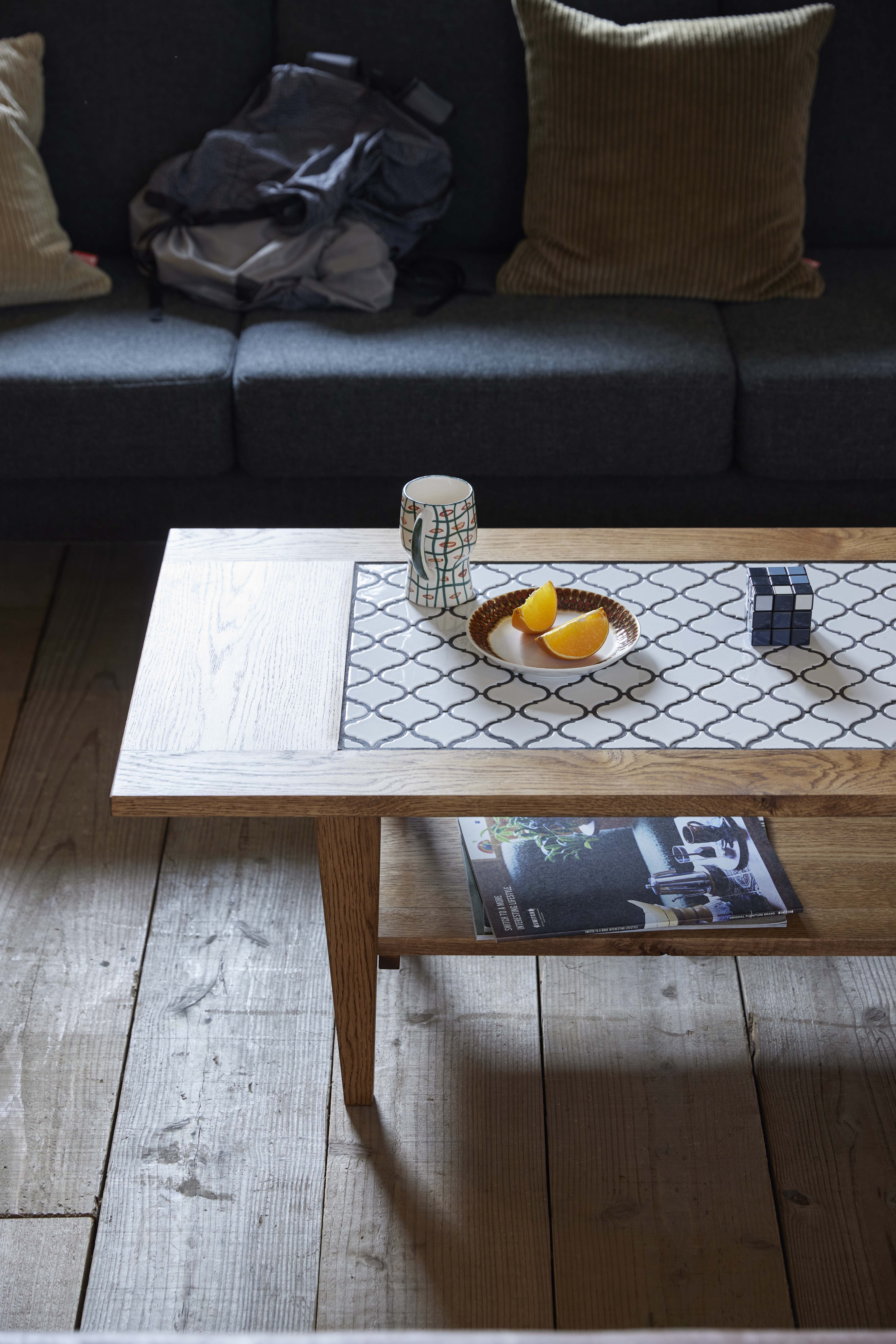 こちらの棚は、Tile Living TableおよびMajolica Living Tableに取り付けて使用できる棚です。テーブル下の空間を有効活用し、リビングでの使いやすさを高める実用的な収納アイテムとして設計されています。